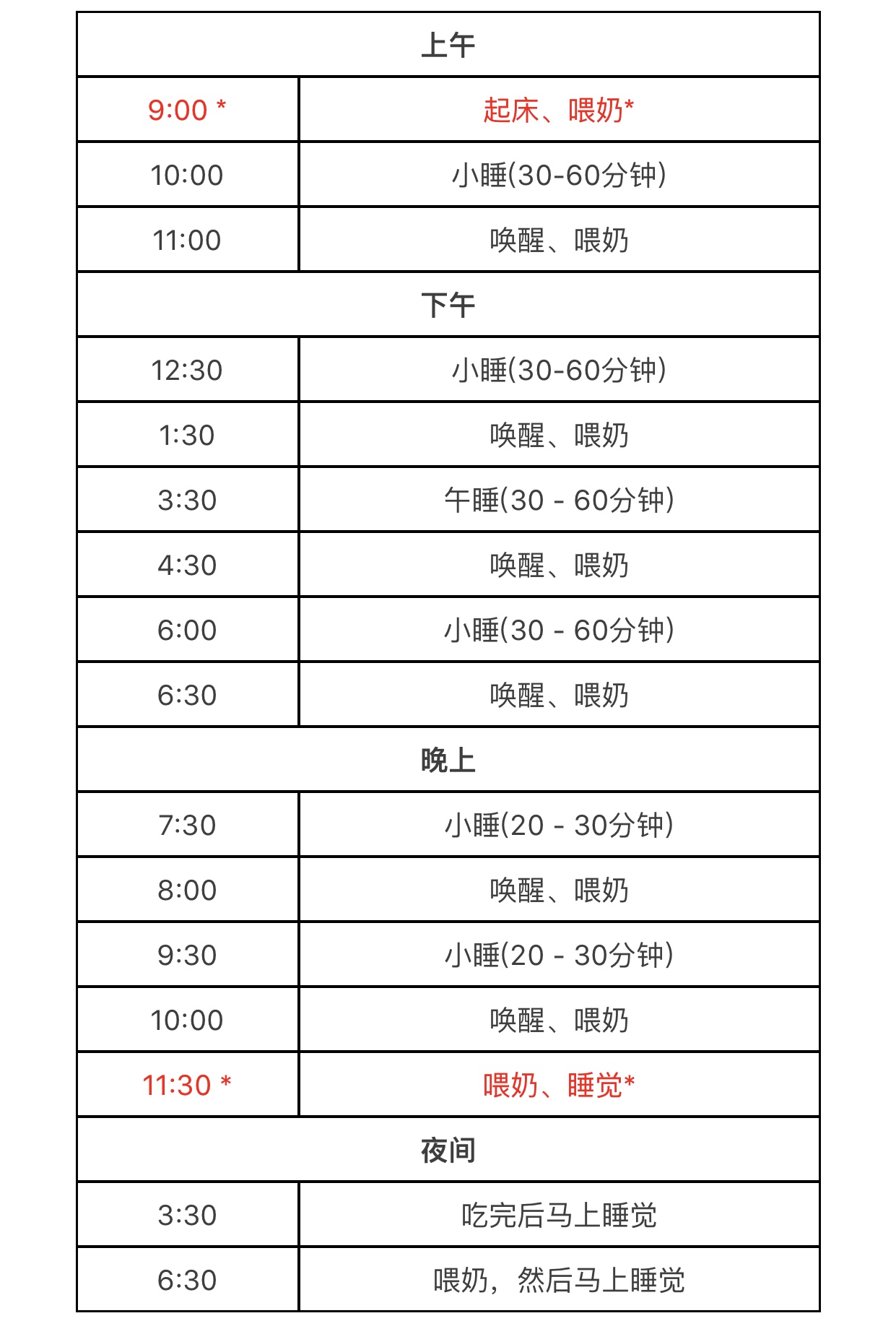 不一樣的喂養(yǎng)方式作息也有一些差別,這個月齡是兩個示例表。